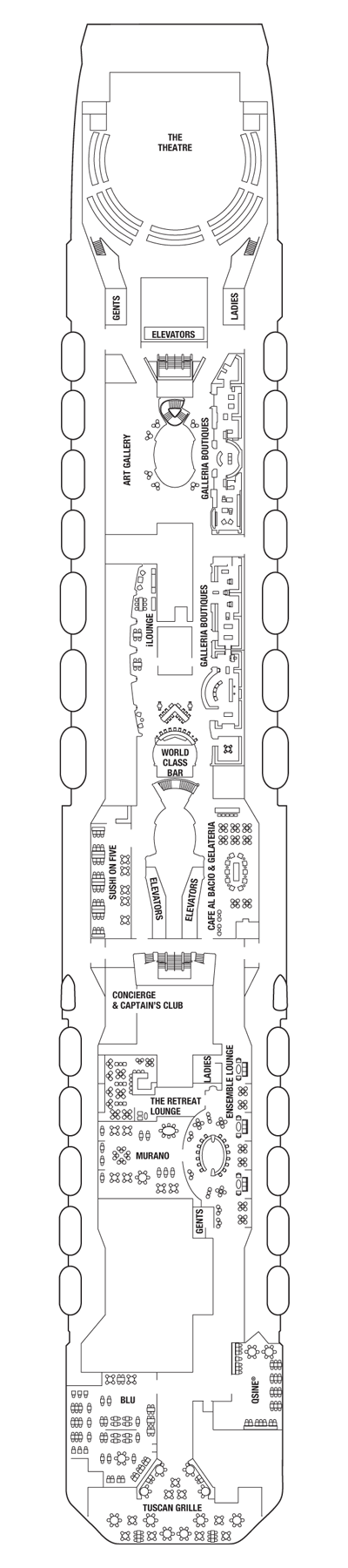 Beautiful walkways lead you from sophisticated boutiques to fine jewelry stores that hold stylish clothing, precious gems, cosmetics, fragrances and more. Window shop, attend a fashion show or select gifts for friends and family. Then, indulge yourself as you encounter the ideal memento of your truly extraordinary cruise experience.